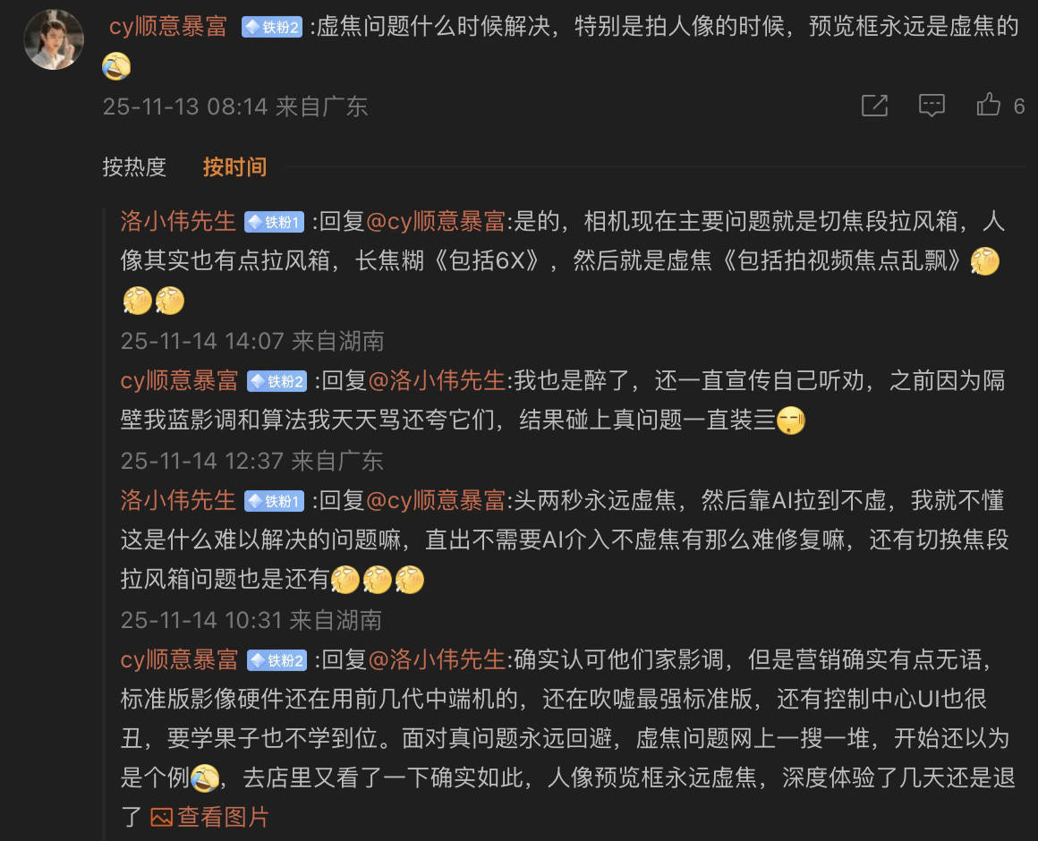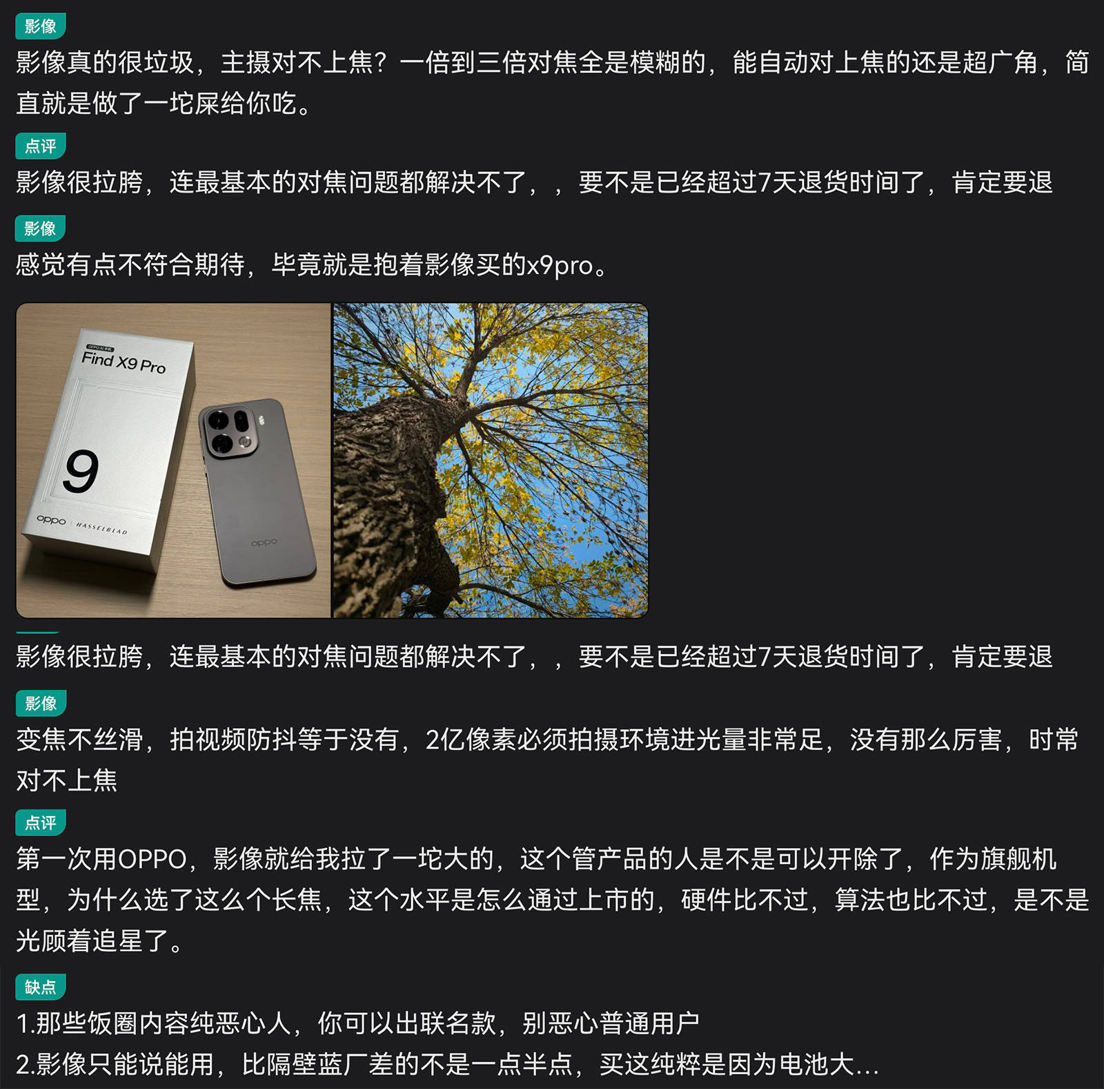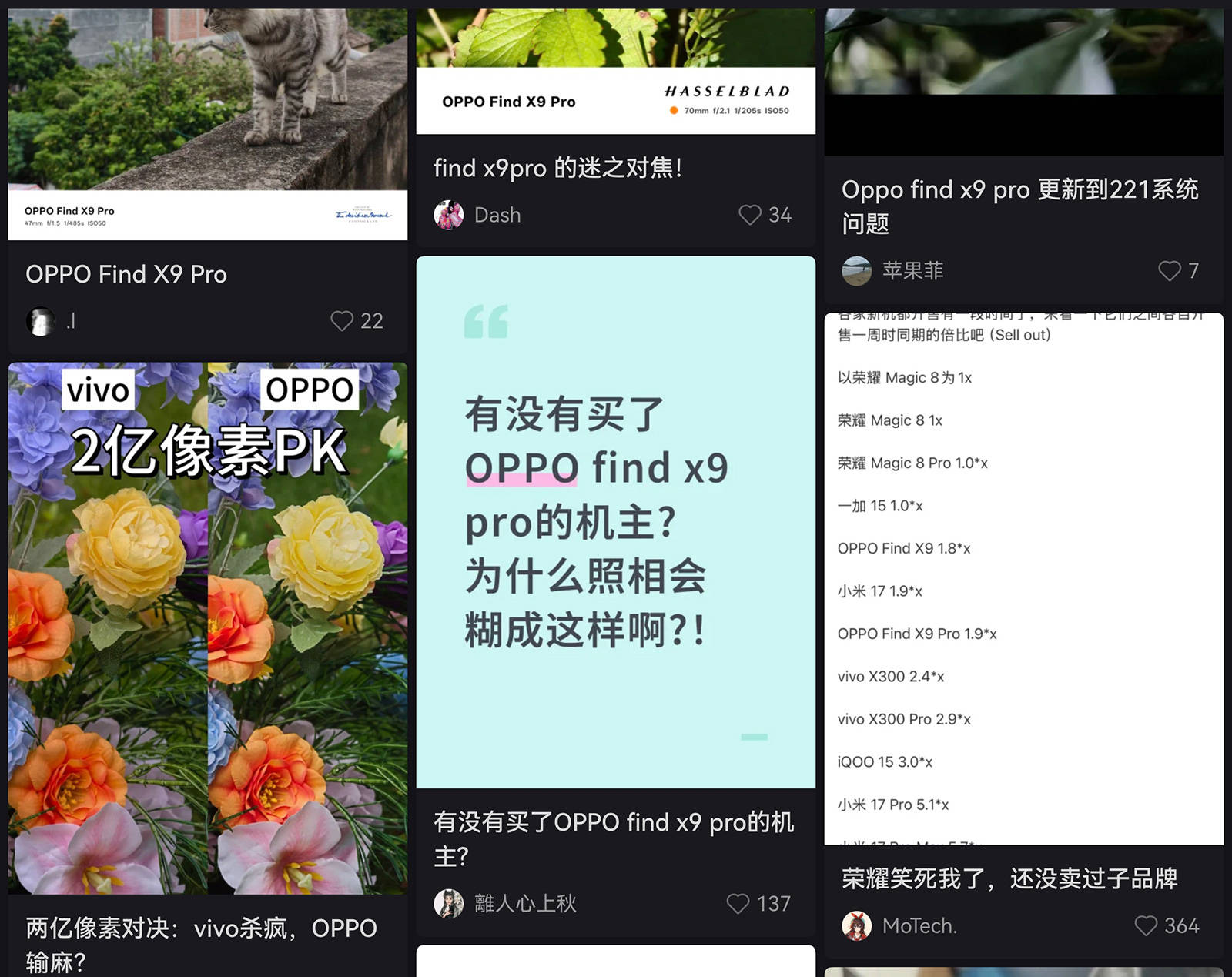 憑借孫穎莎代言、“萬元內最值得購買的相機”、口袋哈蘇、全焦段哈蘇8K超清照片、等亮點,OPPO Find X9 Pro一度炙手可熱。然而不少用戶入手后發現,OPPO Find X9 Pro主打的影像體驗與官方宣傳相差甚遠。據大量用戶反饋,這款手機在對焦準確性、2億像素畫質、夜景照片、影像算法、視頻拍攝效果等多方面均存在不足,在社交平臺吐槽的帖子及評論隨處可見。
