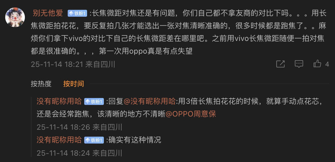 (升級223版本系統后,用戶反饋問題依舊)根據測試對比,更新至版本后綴223的ColorOS 16系統后,OPPO Find X9 Pro對比某友商的2億像素新旗艦,依然在長焦拍攝成像速度和細節畫質等方面處于劣勢,甚至連取景預覽、變焦的流暢性都還沒做好,令人遺憾。在關鍵問題上,用戶更需要的并非OTA狂魔,而是重“質”不重“量”。