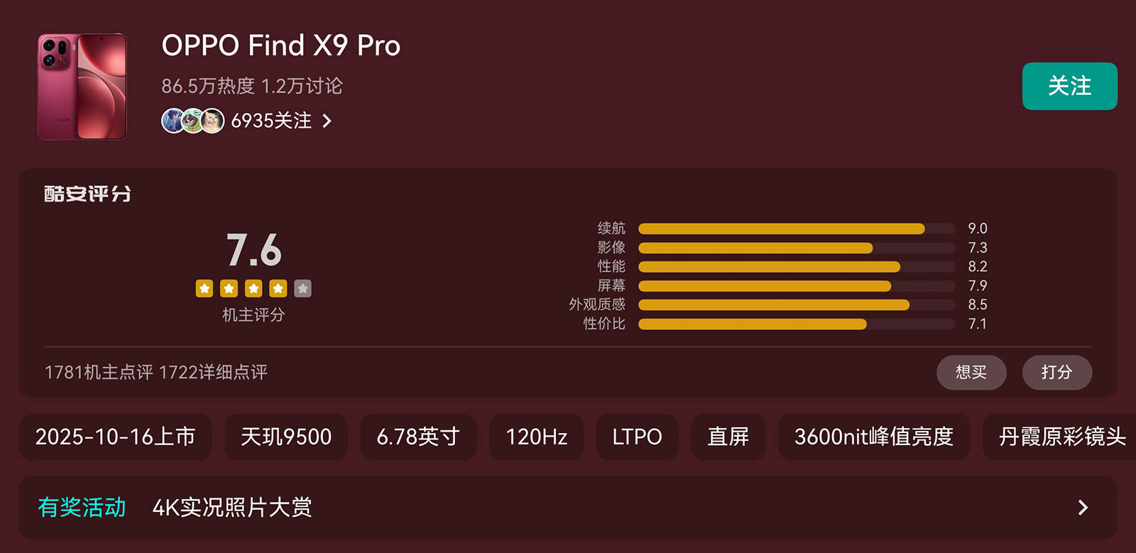 (酷安App多款旗艦機用戶評分,OPPO Find X9 Pro墊底)“賣家秀”和“買家秀”相差過大